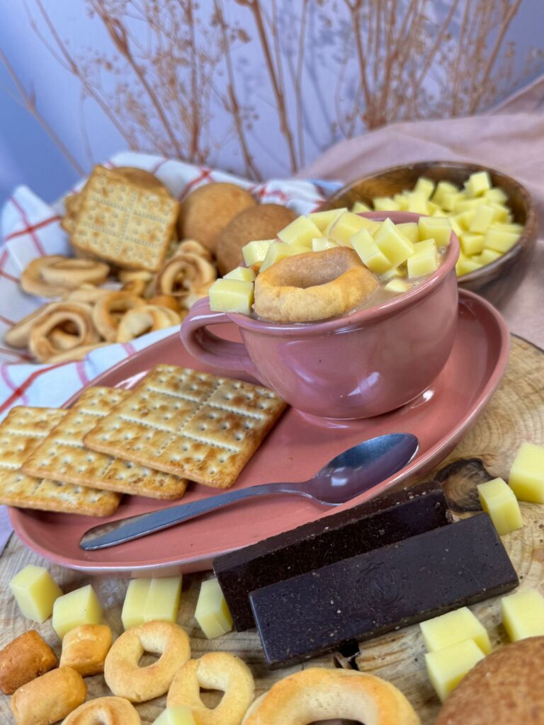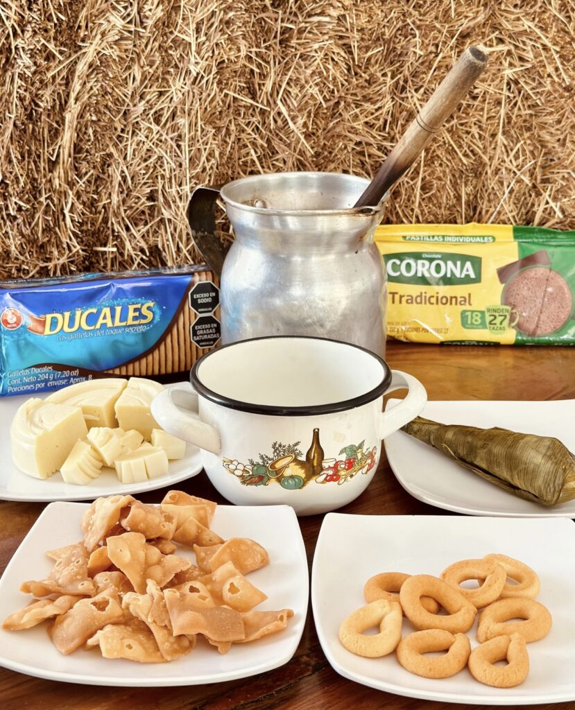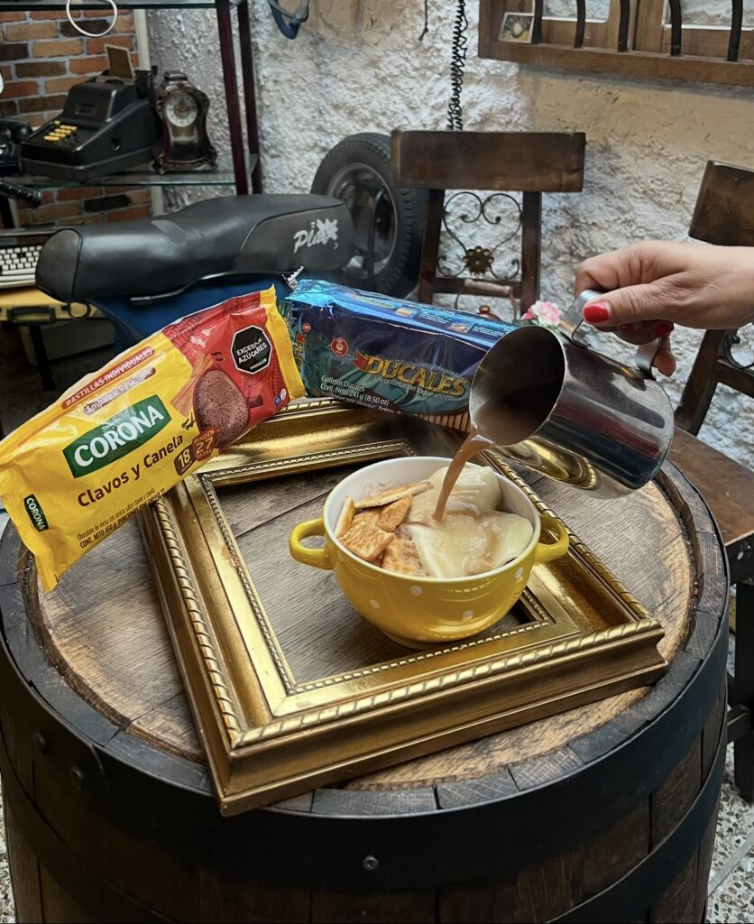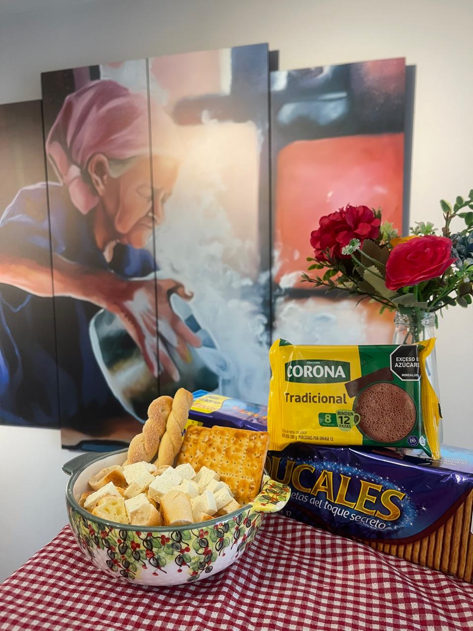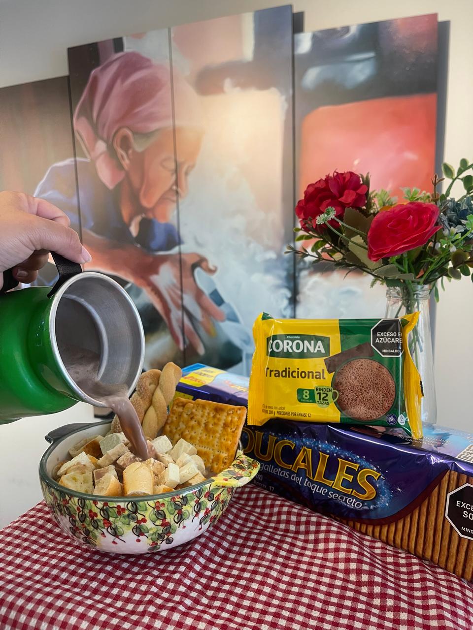 En nuestra taza “mita” (en honor a las abuelitas), agregamos “parva” de nuestra preferencia. En este caso: Almojabana, buñuelo, pan de queso, torcidos, quesito y el toque secreto que se lo dan nuestros productos infaltables y más pedidos, GALLETAS DUCALES y CHOCOLATE CORONA. Así, está listo para que con este delicioso manjar nos sumerjamos en los cálidos recuerdos de nuestra infancia.