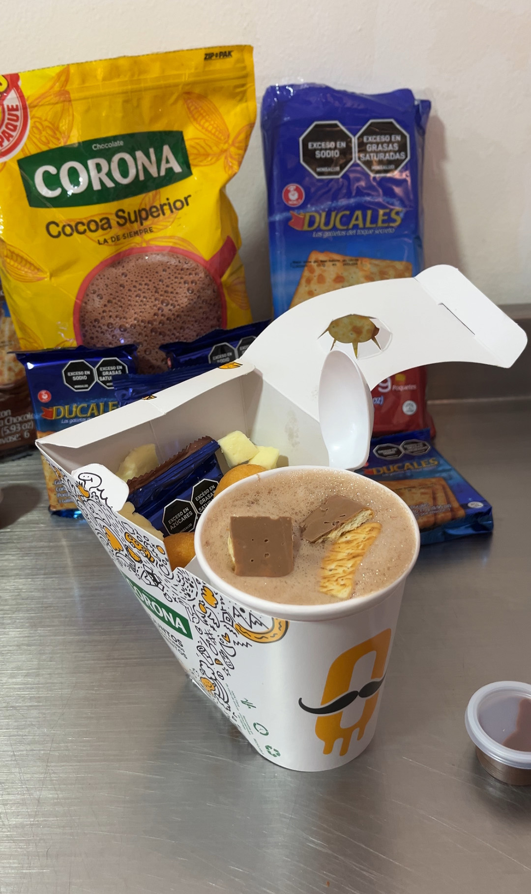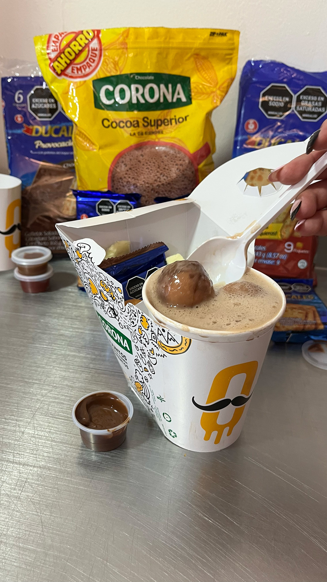 Un delicioso y caliente CHOCOLATE CORONA de 12 onz, acompañado de Galletas Ducales que puedes elegir entre su versión Clásica y versión Provocación, cubos de queso mozzarela y 5 Mini Buñuelos que podrás disfrutar todo mezclado o por separado. Adicional, podrás elegir un topping de acompañamiento de chocolate, arequipe o bocadillo, al mejor estilo de Sr Buñuelo